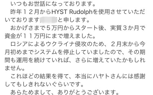 稼働時間の指定機能が付く前のHYST Rudolphは、僕の他にも現在350名を超える方が無料で利用していて、多くの実績を上げています。